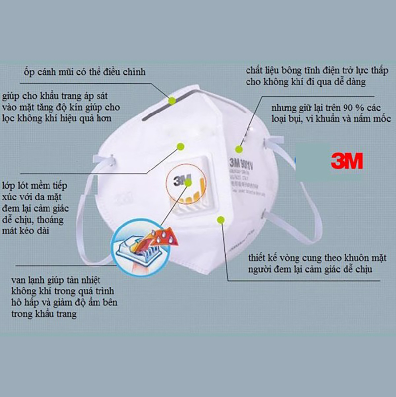 Chất Liệu: Màng lọc tĩnh điện tiên tiến 3M, hiệu suất lọc chuẩn Niosh 95% với kích thước 2.5PM